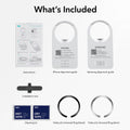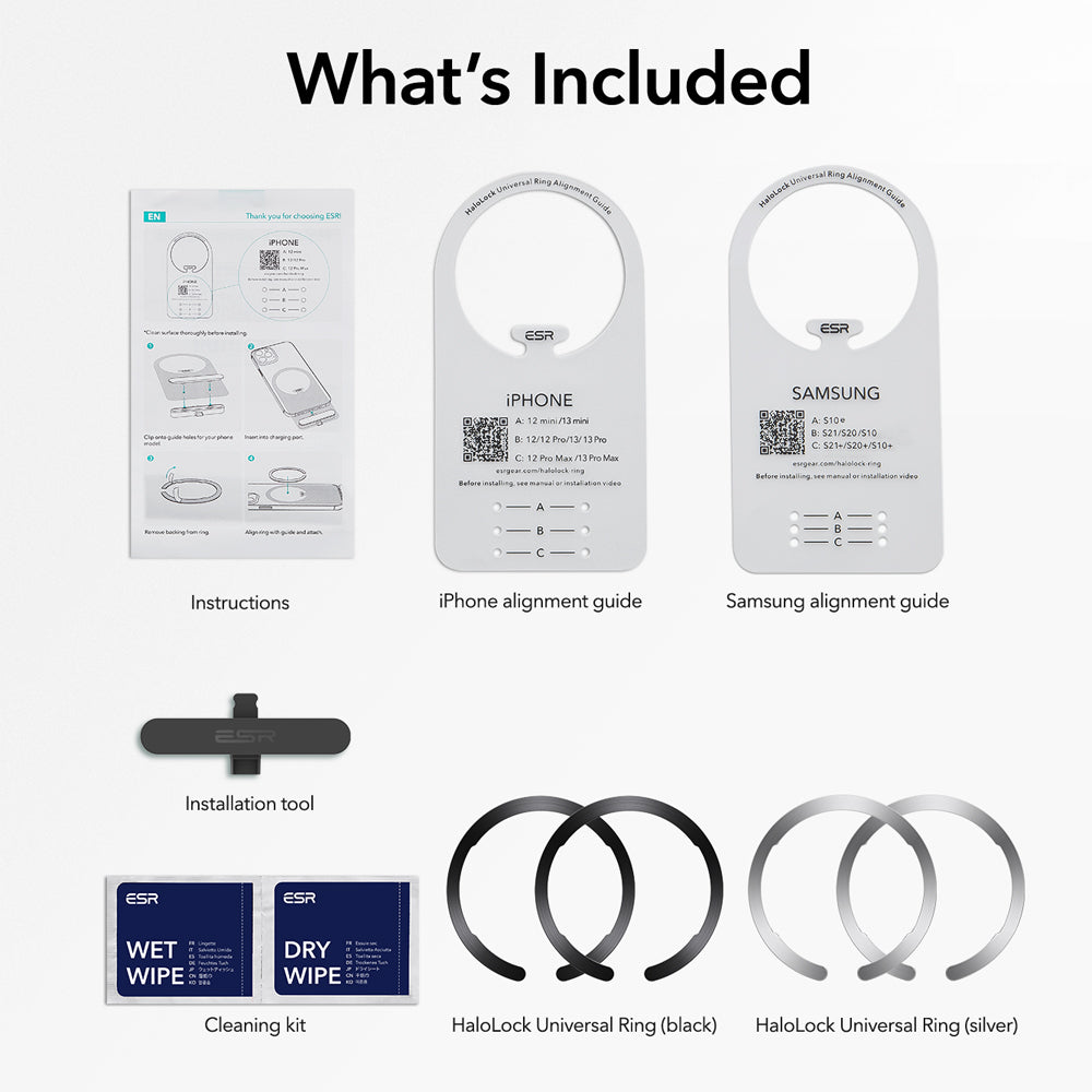 Lieferumfang : HaloLock Universalring x 2/4, Reinigungsset x 2/4, iPhone-Ausrichtungsanleitung, Samsung-Ausrichtungsanleitung, Installationstool