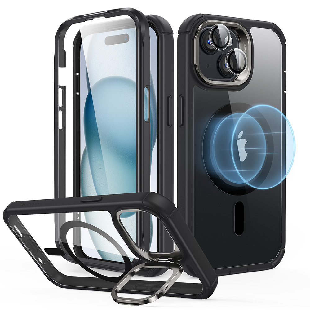 iPhone 15 Plus Armor Tough Case mit Stash Stand (HaloLock) – Transparent Schwarz