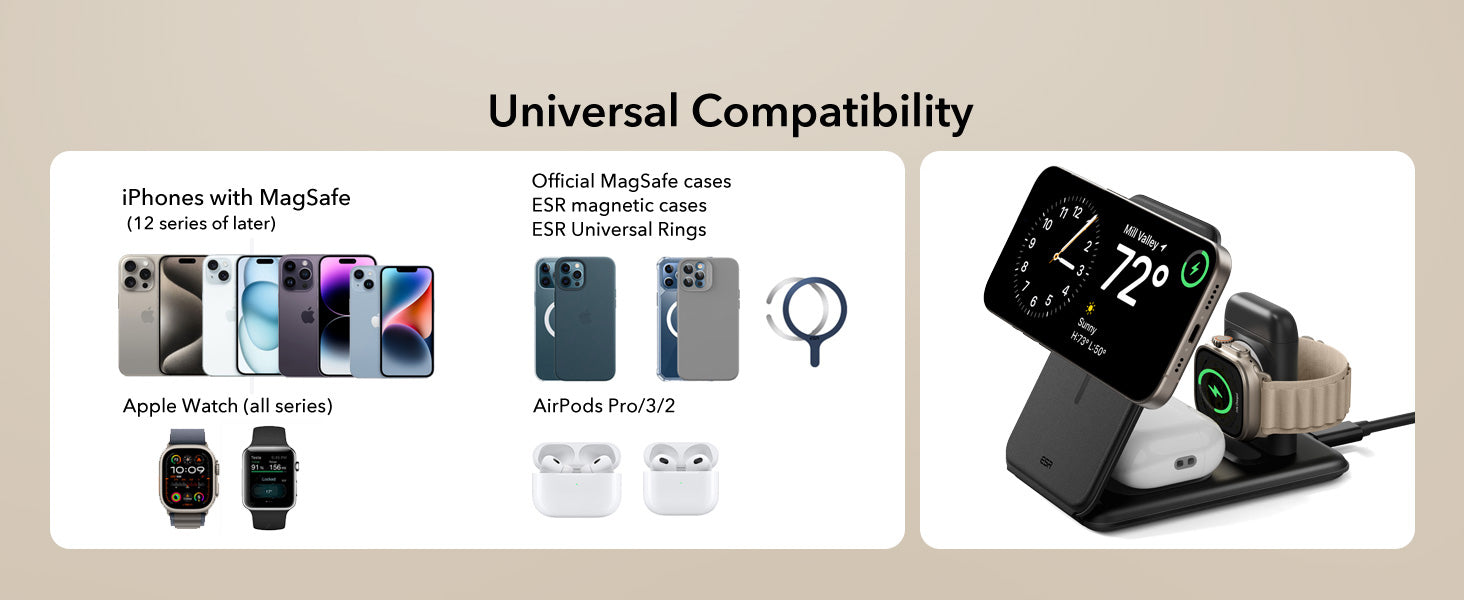 Compatibility: For iPhone 13 series or later, AirPods 3/2/Pro, Apple Watch (all series), official MagSafe cases, ESR magnetic cases, and ESR Universal Rings